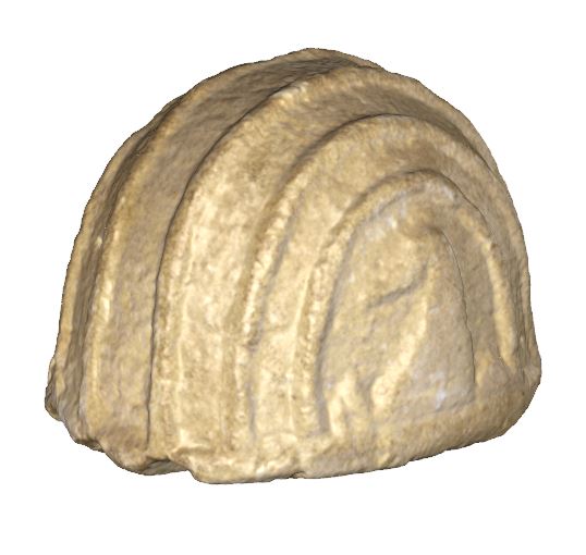 This architectural element is carved as a hemisphere. On the sides, the shapes of a water-bird are sculpted in bas-relief. Seven “ribs” are also carved on its circumference and some channellings on the flat bottom (these ones were probably used for mounting the artefact on a stand). This type of elements, found only in Sarmizegetusa Regia, was probably decorating the upper parts of the stone walls. Find spot: Grădiștea de Munte – Sarmizegetusa Regia (Hunedoara county) Dimensions: length - 25,5 cm; width: 20,5 cm; height - 18,7 cm Material: limestone Technique: carving |
