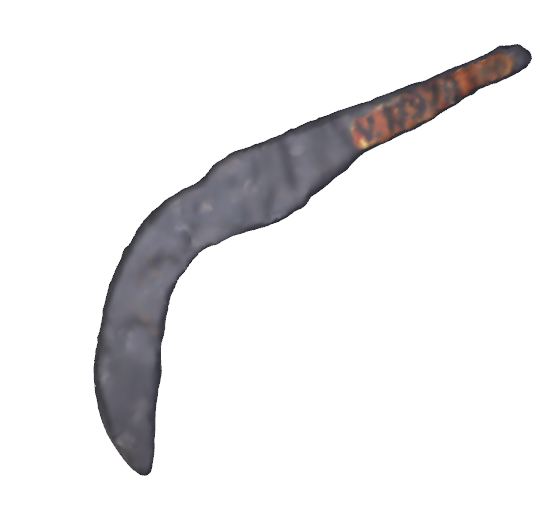 The item looks like a small knife with a curved blade and a rectangular tang on which a wooden handle was attached. The same as nowadays, it could have been used in agricultural activities (pruning grapevines, for example) as well as for various household needs. Find-spot: Grădiştea de Munte – Sarmizegetusa Regia Dimensions: length – 12 cm; width – 1,5 cm Material: iron Execution technique: hammering |