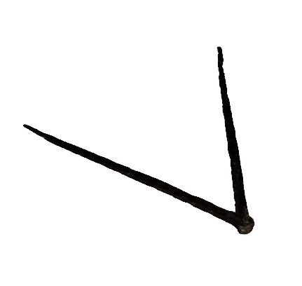 The item has two legs in the shape of two flattened rods, sharpened at one end while the other ends in a round orifice. In this orifice there used to be a nail which united the two legs and which in its turn had a rectangular hole in the middle into which an iron wedge went. It was meant to block the two legs in a specific open position. Dividers were tracing and measuring tools used especially by carpenters or stonemasons. Find-spot: Grădiştea de Munte – Sarmizegetusa Regia (Hunedoara county) Dimensions: length – 35 cm; width – 2,3 cm Material: iron Execution technique: Hammering |