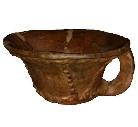 The vessel has a truncated body, a rounded rim and a straight flat bottom. The large handle is attached to the rim and the bottom. The ornaments are impressed cordons placed horizontally under the rim and at the base of the handle, as well as vertically. This type of cup was mainly used for lighting, the vessel contained liquid fats on which there was a fuse floating on a wooden rest. This type of vessel is less frequent among the pottery finds in the Orăştiei Mountains Dacian settlement area, then it is in many other Dacian settlements. Find spot: Grădiştea de Munte – Feţele Albe (Hunedoara county) Dimensions: height - 8,5 cm; rim diameter: 17,7 cm Material: clay, coarse reddish paste Technique: hand built, oxidation firing |